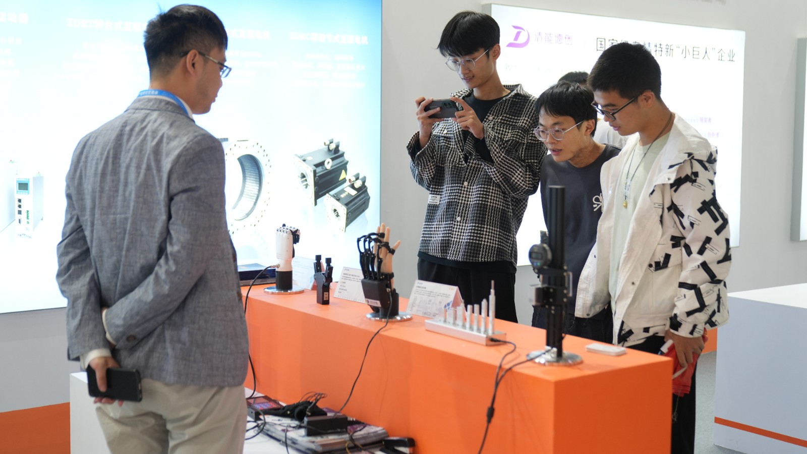 因時機器人作為機器人行業優秀的零部件制造商,受邀在本次大會的機器人及智能制造展出展。現場不僅展出了黑科技滿滿的仿人五指靈巧手和穿戴式外骨骼,動態的微型伺服電缸裝置也讓參觀者了解到機器人能夠靈活運動的機制原理,精巧的機器人零部件吸引眾多觀眾駐足。